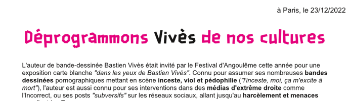 Les violences sexistes et sexuelles pour les travailleur-euses du monde de la culture et du divertissement sont trop courantes, et donner une plateforme à un auteur aux propos et productions telle que celles de Bastien Vivès montre une nouvelle fois que la mise en sécurité des femmes et personnes minorisées n’est pas une priorité.